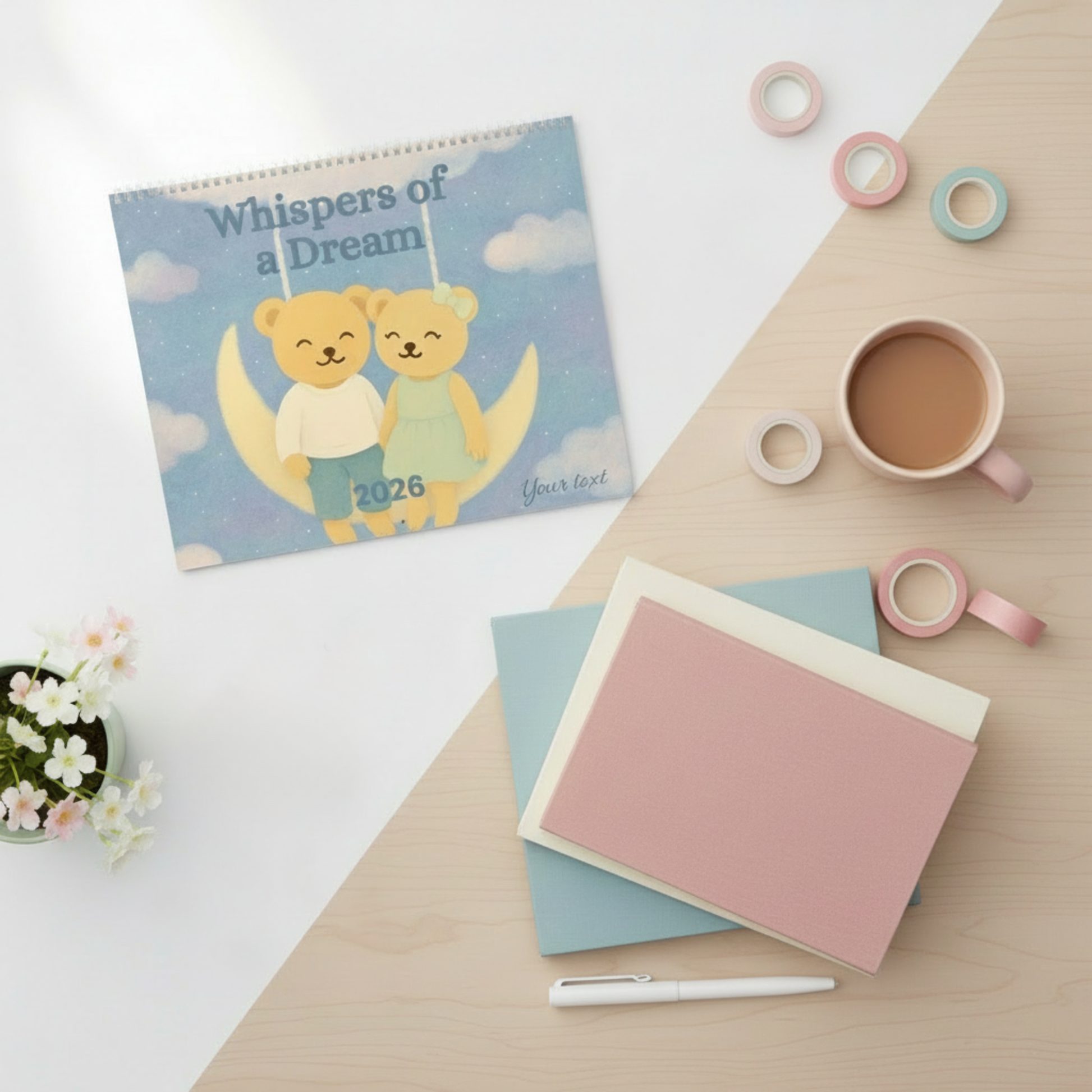 Dream through every month of 2026 with Aimo & Bibi. A cozy wall calendar filled with gentle quotes, pastel skies, and daily moments of calm.