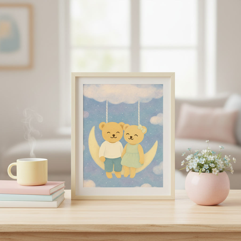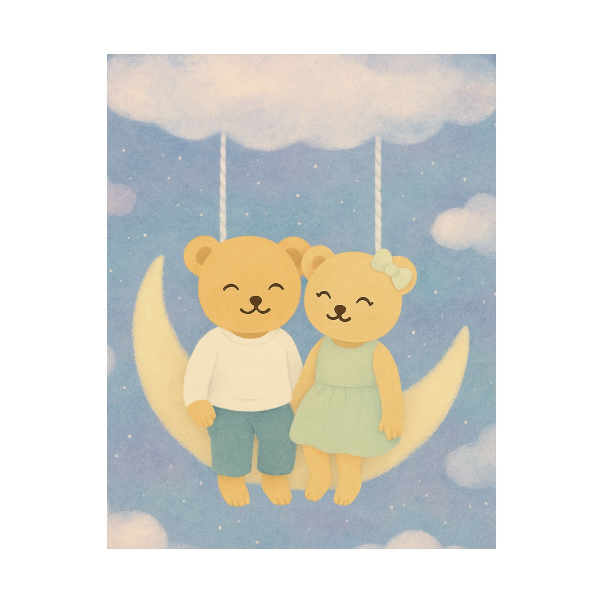 Two bears on a crescent moon swing — a soft pastel art print to bring warmth and wonder to any nursery, reading nook, or gentle space.
