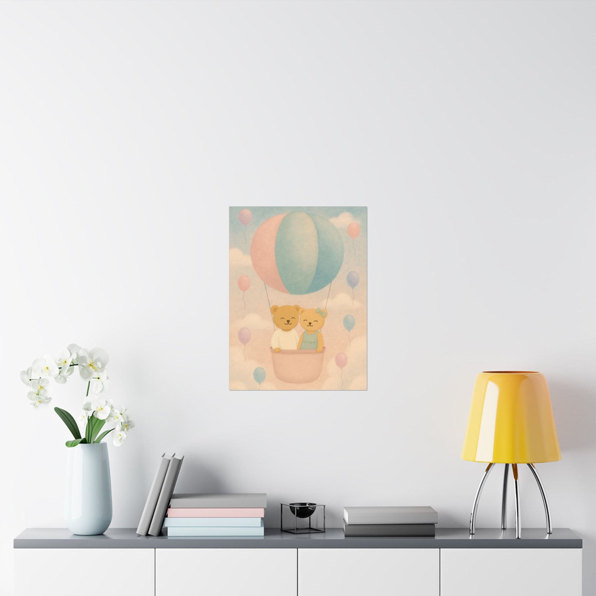 Float into calm skies with Aimo & Bibi. A soft pastel art print reminding you to rise gently, dream freely, and believe in quiet miracles.